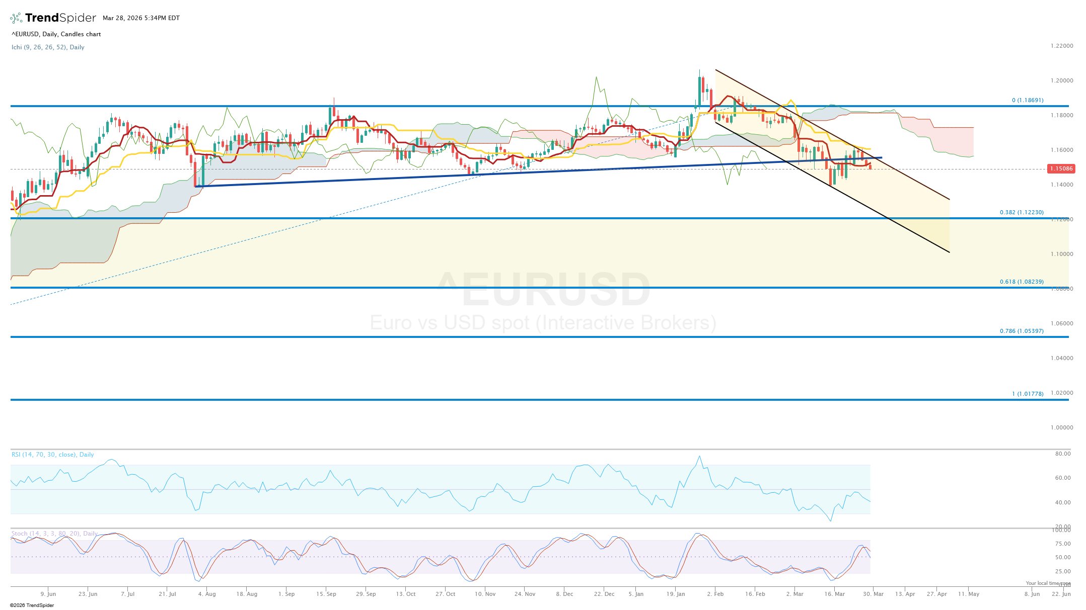 Technically EURUSD is in a bearish short-term trend. Price is making lower lows and lower highs. Price is inside a downward sloping channel. Price has broken below support trend lines. Price has also broken below the Daily Kumo (cloud). My ideal target from January was the 1.12 area. EURUSD remains vulnerable to more downside as long as the short-term trades below 1.1635.