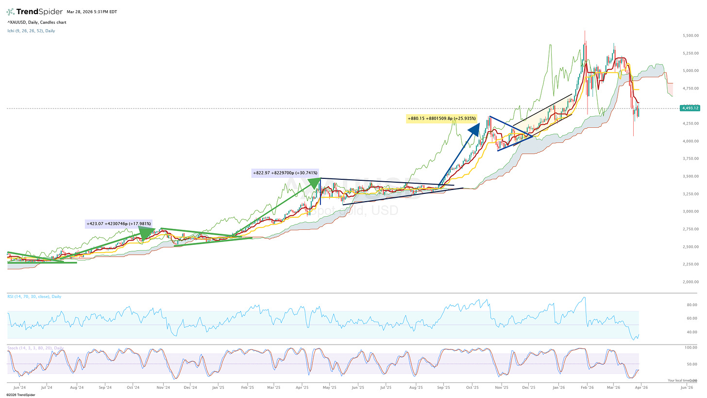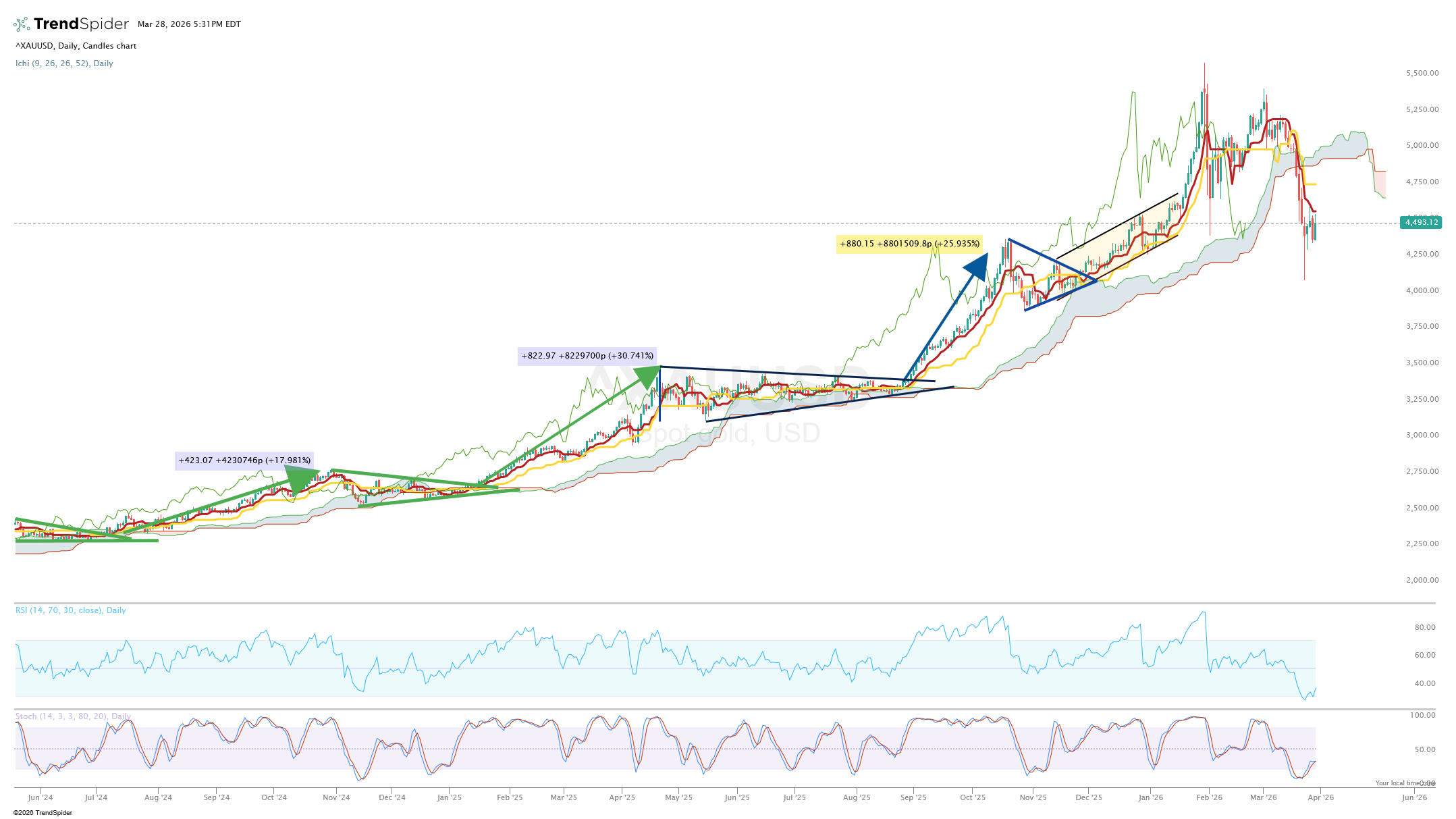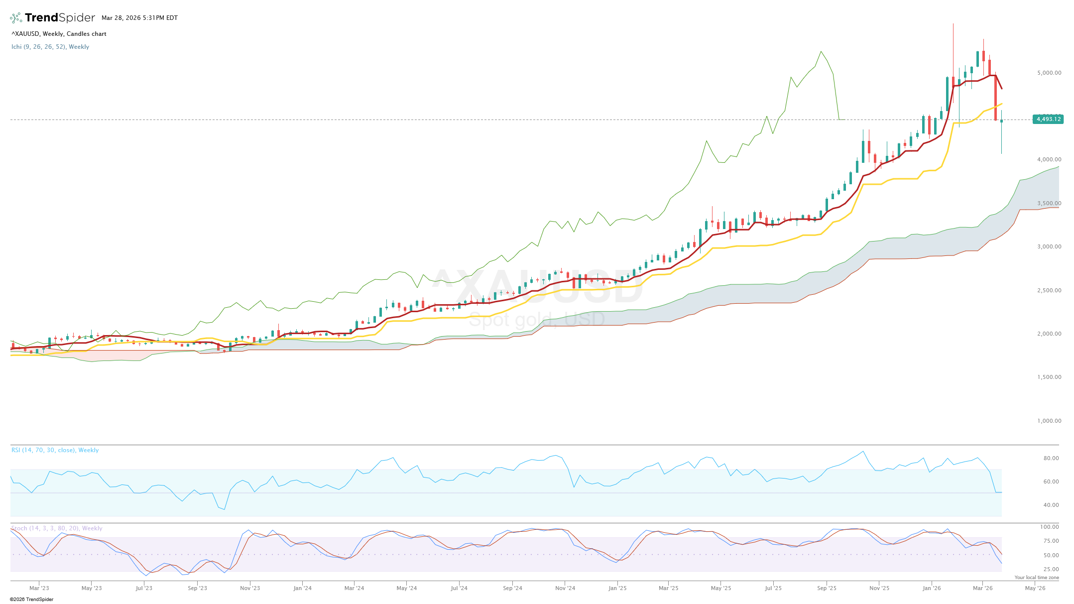 Gold price as expected has made new lows below February lows. In the Daily chart price has broken below the cloud support. In the weekly chart I believe we can see price testing the cloud support at $3,700.